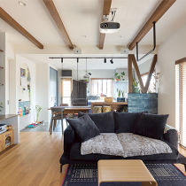 時代や生活の変化に伴って、この先も愛犬と一緒に楽しく暮らしたいと、思い切ってリフォームされたI様。和室をなくし、1階をワンフロアの大きなLDKに。キッチンの向きを変えてⅡ型にしたことで、「前は孤独に料理をしていたけれど、テレビを見たりおしゃべりしながら家事ができる」と、奥様も満足されています。取れない柱や筋交いと梁を同色で塗装して一体感を持たせ、大きな窓にはウッドのルーバーを。家具やクロスのネイビーをアクセントに、“木”とバランスのいい上品な空間に仕上げました。