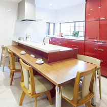 ダイニングが狭くて、子供や孫たちが遊びに来ても一緒に食事をする場所がなかったと言われるT様。ダイニングと和室の間にあった壁を撤去し、一体で使える広々したダイニングキッチンに。床と畳という床高の異なる二つの空間を、その段差を利用して、キッチン側からは椅子、和室側からは床に座って使えるよう特注でテーブルを作りました。ロールスクリーンで2つの空間を仕切れるので、急な来客時にも安心。子供や孫が来たときには、ロールスクリーンを上げると6人がゆったり座れます。