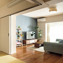 リビングと和室をひとつの洋室にして個室を充実させました。TPOに応じて空間を仕切れる開閉壁や通り抜けが可能なクローゼットを組み合わせ、光・風・互いの気配を感じられる安心の住まいになりました。施工店: リファイン草津 株式会社東和不動産