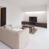 現代的でスタイリッシュな空間へ、中古マンションをリフォーム。コストを抑えるために水廻り設備の位置を動かさず、リビングダイニングを窓側へ移設して広い空間を確保。開放感を感じられる明るい空間になりました。圧迫感のないローボードの「キュビオス」と間接照明で、シアタールームの雰囲気を演出。大理石調の白い床にダークカラーの建具を配した、高級感のある上質な空間となりました。施工店: リファイン蒲田 東邦ハウジング株式会社(旧:リファイン蒲田)