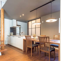 既存の間取りは活かし、キッチンをカウンター付きタイプに一新。学校や部活で忙しいお子様もさっと食事を取れます。デザイン性にもこだわり、LDKの吹き抜け天井に間接照明を配置し、あかりによるくつろぎ感をプラスしました。窓からの光と照明の光で住まいの魅力が最大限に引き出され、洗練された空間へと進化しました。施工店: 株式会社LEPRO