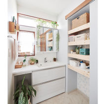 洗面台は、間口幅に合わせてワイドカウンターを設置。カウンターの下にゴミ箱をスッキリ収納、上には大切に育てているグリーンを飾れます。3面鏡の幅をコンパクトにし、既存の窓を残したことで、明るい洗面室になりました。引き出し収納にタオルやストック品がたっぷり入るうえに、右側の壁面にも大きな収納スペースを確保。入れる物に合わせて棚をつけたので置き場が決まり、すっきり片付きます。