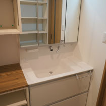 使い勝手が悪く、狭い浴室と洗面所の収納不足が悩みだったH様ご夫婦。玄関横の収納スペースを浴室に取り込むアイデアで、広々とした一坪タイプのシステムバスを実現しました。キッチンに洗面所への出入口を設けて、移動距離が最短でラクに。また、使いやすくなっただけではなく、リビングの空調が洗面所にまで届くようにもなり、日々の暮らしの快適さを一層高めています。洗濯機置き場の移動により広がったスペースには、収納力もたっぷりの幅の広い洗面台を設置。「まるでホテルみたい」と奥様も大満足です。施工店: リファイン五日市 株式会社丸共(旧:リファイン五日市)