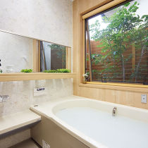 緑の木々を眺めながらゆったりお風呂に入りたいというご主人の希望をかなえたN様邸。外構と浴室をあわせてプランニングし、坪庭の見えるお風呂が完成。浴室から続く洗面脱衣室を裏の押し入れ側に広げ、明るく開放的な水廻り空間が生まれました。施工店: 平和住宅建設株式会社 平和住宅リフォーム (旧:リファイン大久保)
